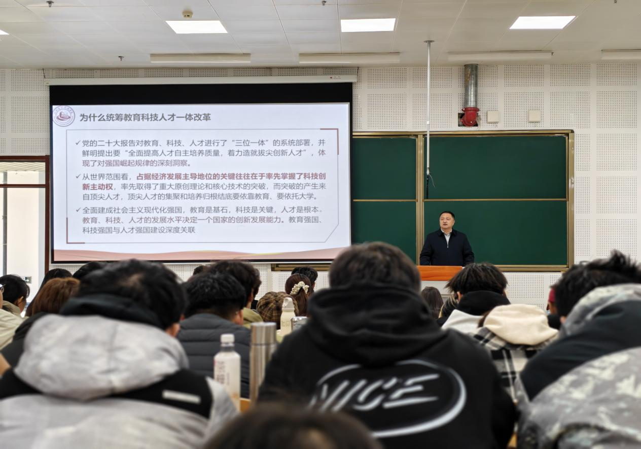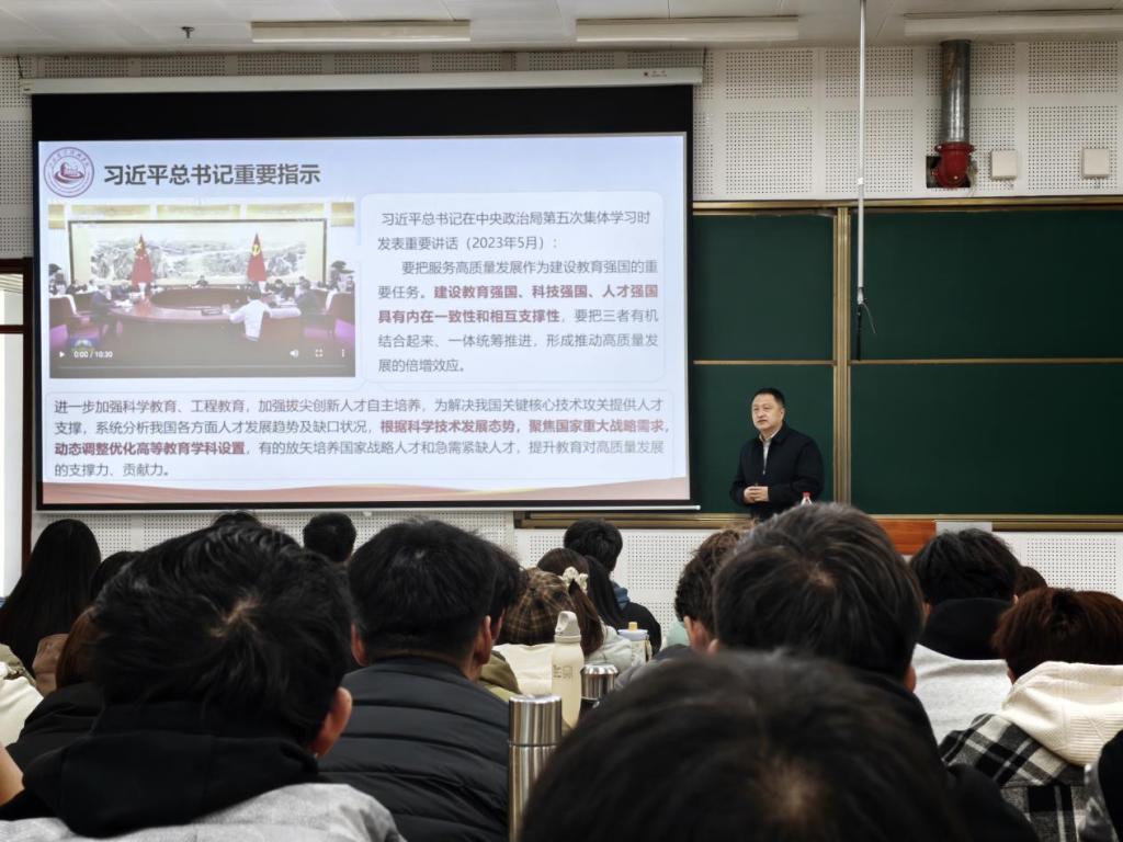 课堂伊始,孙校长系统解读了习近平总书记在党的二十大报告、全国教育大会、党的二十届四中全会中等多个重要会议中关于教育、科技、人才工作的重要论述,深刻阐释三者“内在一致、相互支撑”的核心逻辑,同时结合我校专业特色与校企合作实际,具象化呈现高校在衔接教育链、科技链、人才链中的关键角色,让理论知识贴合办学实践。