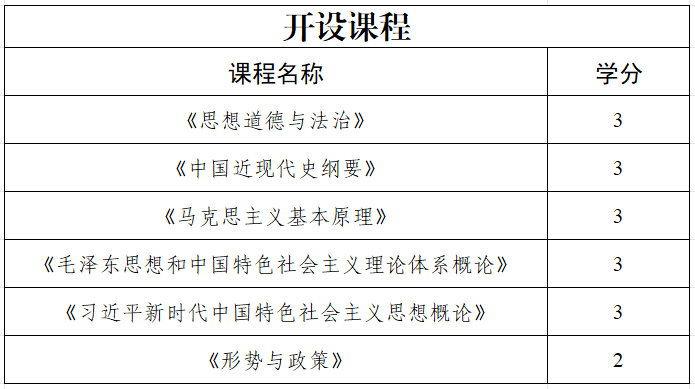 根据《新时代学校思想政治理论课改革创新实施方案》要求,落实立德树人根本任务,发挥思政课程在大学生成长成才中的重要作用,增强学生的使命担当,重点引导学生系统掌握马克思主义基本原理和马克思主义中国化理论成果,了解党史、新中国史、改革开放史、社会主义发展史,认识世情、国情、党情,深刻领会习近平新时代中国特色社会主义思想,培养运用马克思主义立场观点方法分析和解决问题的能力;自觉践行社会主义核心价值观,尊重和维护宪法法律权威,识大局、尊法治、修美德;矢志不渝听党话、跟党走,争做社会主义合格建设者和可靠接班人。我校开设以下思政课程:
